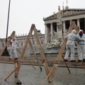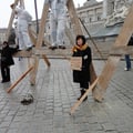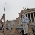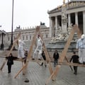 Ein Umstand, der Werner Brix auf die Palme bringt. Oder besser gesagt auf das Triple A. Um auf die prekäre Lage der Kleinst-UnternehmerInnen öffentlich aufmerksam zu machen, kreuzigte sich der Kabarettist gemeinsam mit zwei mutigen MitstreiterInnen am 28. Feburar 2012 vor dem Wiener Parlament, symbolisch auf einem selbstgebastelten AAA aus Holz. Eine eindrucksvolle, etwas gespenstische künstlerische Inszenierung, die optisch viel hergab und auch einige Medien anlockte, etwa den Standard, der dazu eine sehr schöne Ansichtssache ins Netz stellte.
